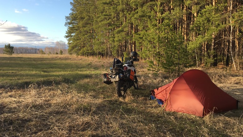 Aus Omsk heraus schaffe ich bei strahlendem Sonnenschein und nunmehr 13 Grad noch knapp 100km in Richtung der sibirischen Hauptstadt Novosibirsk. Heute finde ich links in guter Entfernung zur Straße einen absolut idyllischen Schlafplatz am Waldrand in schönster Abendsonne, der zudem auch noch auf trockenen Feld- und Waldwegen gefahrlos zu erreichen ist.