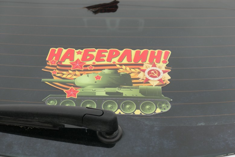 Für etwas Verwirrung sorgt bei mir ein Aufkleber auf einer Heckscheibe eines Autos, den dieses zum gestrigen Feiertag als Schmuck erhielt. Darauf heißt es „nach Berlin!“ über einem Kampfpanzer. Wie soll man das verstehen? Steht das im Zusammenhang mit der Äußerung eines Russens gestern an einer Tankstelle, der mir seine Meinung zu unserer Kanzlerin mit „Меркель не хорошо!“ (Merkel nicht gut!) aufdrängte?