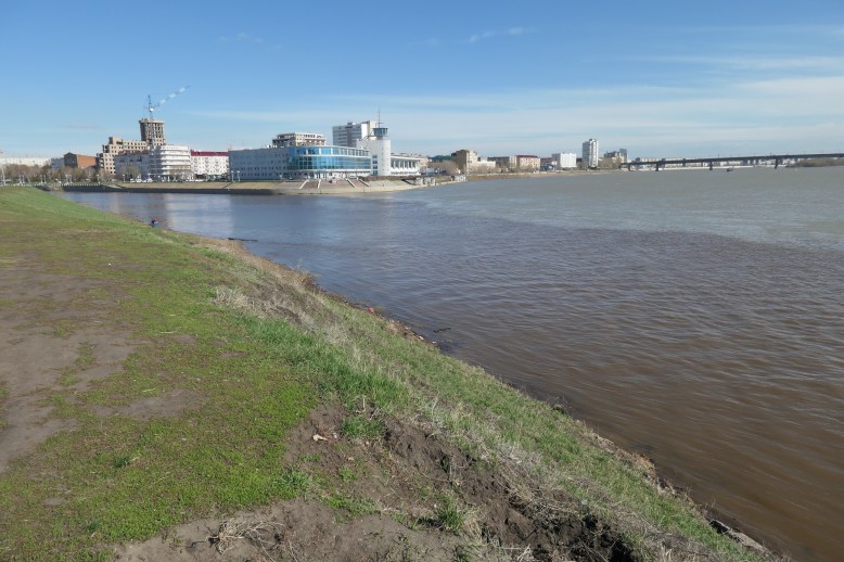 Am 11. Mai erreiche ich mit Omsk die zweitgrößte Metropole Sibiriens. 1,2 Mio. Menschen leben hier. Eine Zeitzone überspringend bin ich hier plötzlich 5 Stunden vor der Berliner Zeitrechnung. Die Temperatur kommt so langsam in erträglichere Zonen. Es sind 12 Grad, doch pfeift hier an der Mündung der Om in den Irtys ein eisiger Wind.