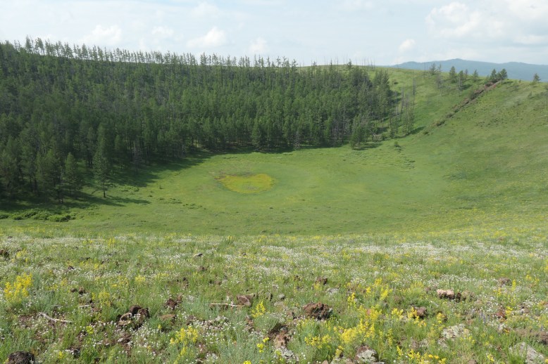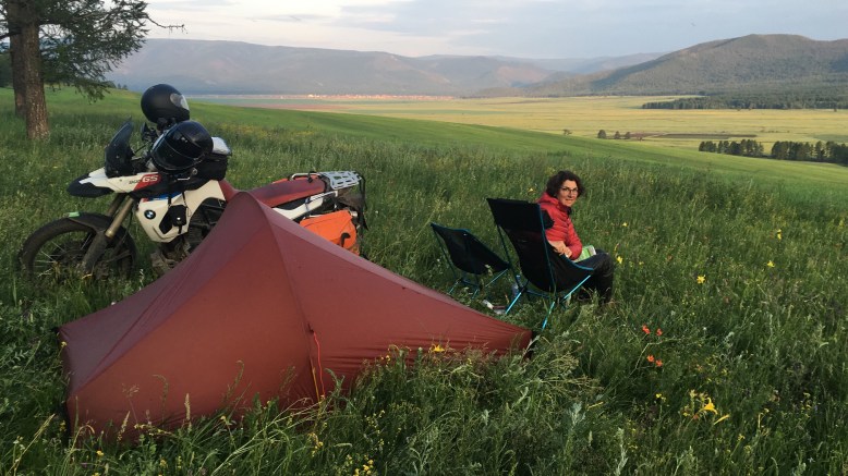 Hinter Erdene Bulgan wollen wir nur noch ein schönes Plätzchen zum Zelten finden, geraten dabei aber auf sehr schlüpfrigen Untergrund – ein bisschen zu viel Anstrengung am Ende eines langen Fahrtages auf schwierigem Grund. Es geht aber gut und dann tut sich rechter Hand eine traumhafte Blumenwiese auf, die ideal als Lagerplatz für die Nacht dient. Etwas erhaben genießen wir auf unseren Campingstühlen – ja so viel Luxus gönnen wir uns – den Blick über das morastige Tal, durch das wir gerade gekommen sind.