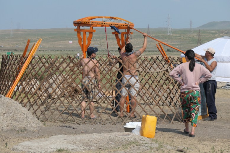 Am Samstag begeben wir uns dann auf unsere gemeinsame 12-tägige Rundreise durch den Nordwesten des Landes. Wir tauschen meine 49l-Tasche gegen ein doppelt so großes Exemplar und fahren an diesem Tag 350km auf Asphalt über Darkhan zum Kloster Amarbayagalant. Während der Mittagspause an einem Khushur-Ger können wir nebenan den Aufbau eines Ger beobachten.