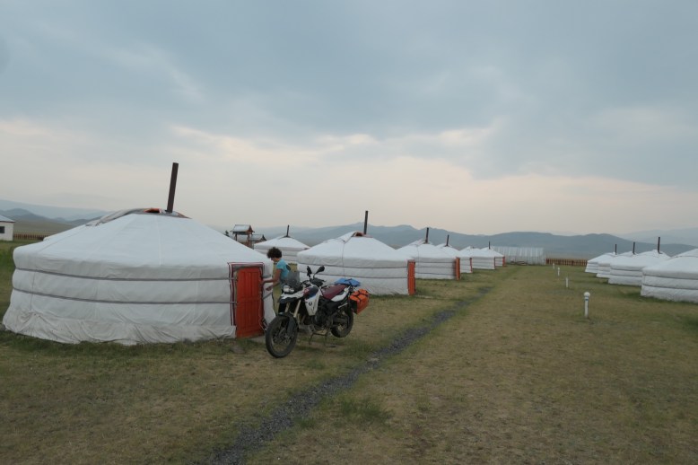 Die letzten 35km verlaufen auf einer mittelschweren Piste durch eine sehr einsame Hügellandschaft. Ariane erweist sich auch auf diesem Untergrund als gute Sozia, die ich fahrerisch kaum spüre. Rechtzeitig zum Abend taucht linker Hand ein Ger-Camp auf, das uns mit einem gemütlichen Ger und einem leckeren Abendessen verwöhnt.