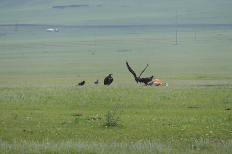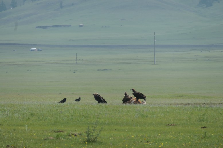 Irgendwie gelingt es uns die Maschine aufzustellen und aus dem Modder zu befreien. Dabei stellt sich Ariane viel cooler heraus als ich, der ich mir wirklich Sorgen um unser Weiterkommen mache. Noch liegen knapp 50km bis Khatgul vor uns und es ist schon nach 18 Uhr. Wir denken beide das gleiche: Lass uns das hier hinter uns bringen und durchfahren nach Khatgul, wo uns schöne Ger-Camps mit Dusche und Abendessen erwarten. Gesagt getan: 2 Stunden später nach einer sehr strapaziösen Fahrt, auf der wir sogar einige Adler zu sehen bekommen, betreten wir unser Ger im Mongol Unji Camp in Khatgul, genießen eine heiße Dusche und ein tolles Abendessen mit Fisch aus dem zweitsaubersten See der Erde.