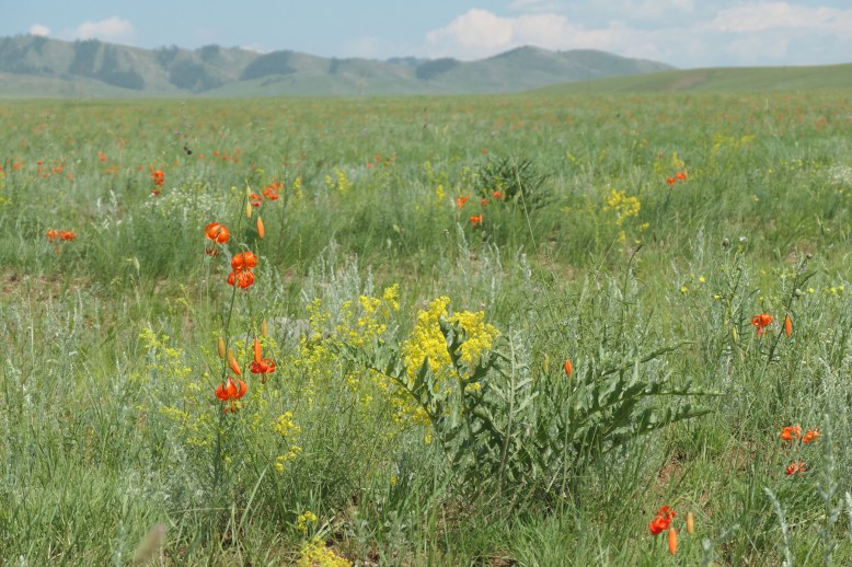 Hier finden wir eine bunte Blumenwiese u.a. mit Feuerlilien, die hier sehr verbreitet sind.