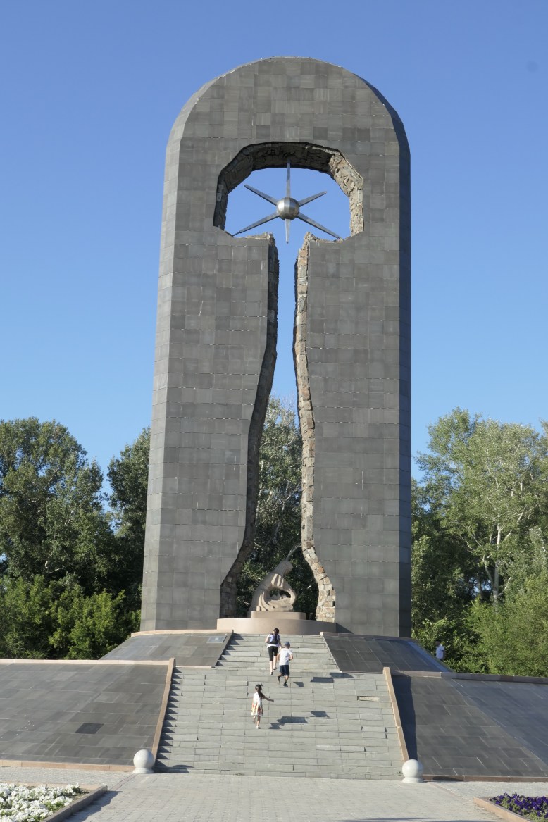 Schon am Vormittag erreichen wir Semipalatinsk, das durch die Atombombenversuche in der Sowjetunion traurige Berühmtheit erlangt hat. Nach dem Weltkrieg wurden südlich der Stadt bis 1989 über 40 Jahre rund 500 Atombomben gezündet – sprich eine Bombe pro Monat.