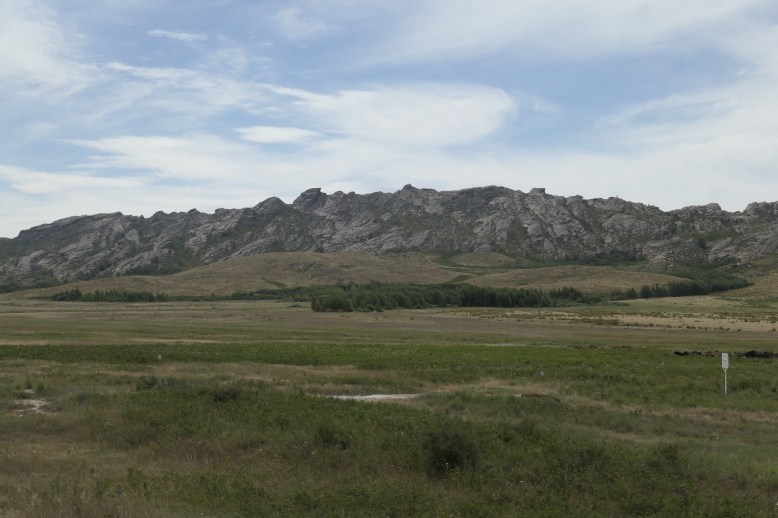 Nach einer sehr ruhigen und angenehm kühlen Nacht bauen wir unsere Zelte schon früh ab, denn die Sonne lässt einen weiteren Aufenthalt im Zelt nicht zu. Die Straße nach Semipalatinsk verläuft durch ein Gebiet, das offensichtlich zu Sowjetzeiten intensiv landwirtschaftlich genutzt wurde und nunmehr brach liegt. Überall zeugen Ruinen von den ehemaligen Kolchosen – es ist ein trauriger Anblick. Auffällig sind die vielen muslimischen Friedhöfe mit ihren sehr prunkvollen Gräbern. Für farbliche Abwechslung sorgen riesige Sonnenblumenfelder in der ansonsten kargen Steppe.