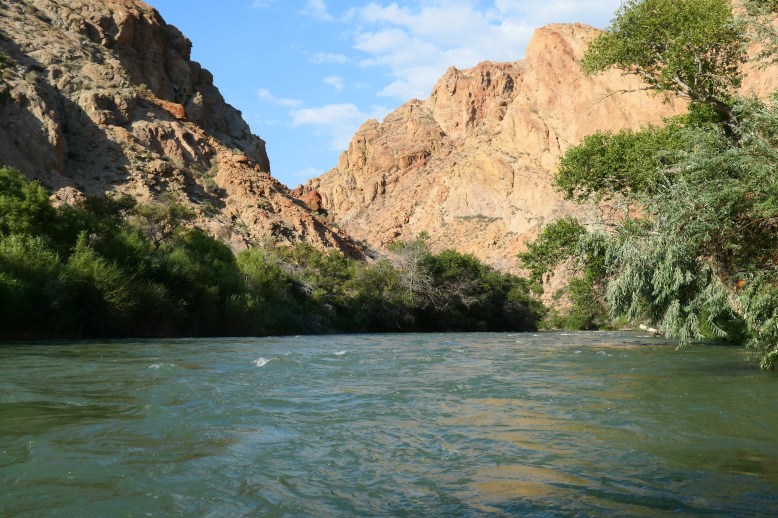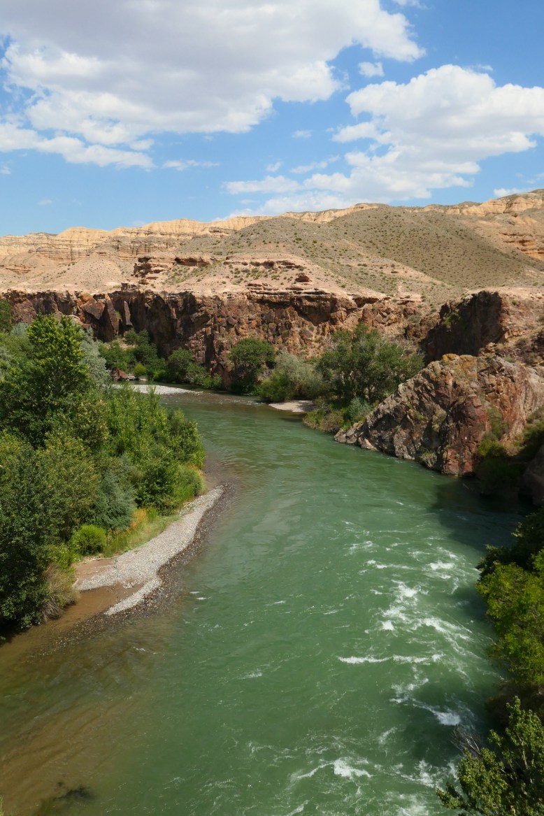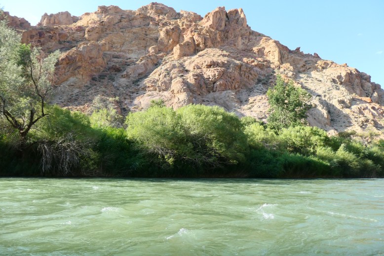 Auf perfekten Straßen und immer mit den Schneekappen des Tien Shan zur Rechten, verlassen wir Almaty am Samstag gen Osten in Richtung des Dreiländerecks Kasachstan-China-Kirgisistan. Quasi auf dem Weg zum östlichsten Grenzposten nach Kirgisistan liegen ein paar der schönsten Gewässer von Kasachstan. Zum einen der Sharyn Canyon und dann die Seen Kolsai und Kaindy in der Nähe von Saty. Von hier sind es Luftlinie nur etwa 40km zum Yssykköl, doch liegt der Tien Shang dazwischen, somit werden wir 300km zum See fahren. Zu Sowjetzeiten gab es beliebte Bergwanderungen dorthin, doch mittlerweile wird diese grüne Grenze durch das Militär streng bewacht, um Übertritte zu verhindern.