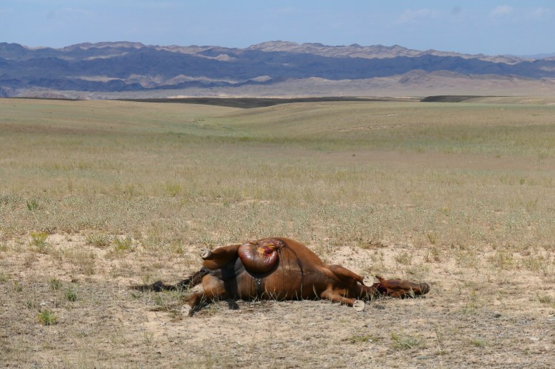 Am Straßenrand finden sich immer wieder verendete Tiere, wie dieses Pferd. Am nächsten Tag sitzen sogar drei Geier auf dem armen Tier und teilen die Mahlzeit – lassen sich dabei aber leider nicht photographieren.