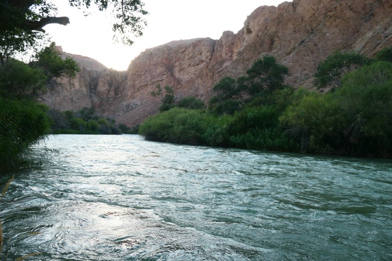 Wir verleben einen wunderschönen Abend, Baden im Stromschatten des Flusses, kochen Pasta Bolognese und beobachten in unseren Campingstühlen die Vögel während der Dämmerung beim Fischfang – einfach herrlich!