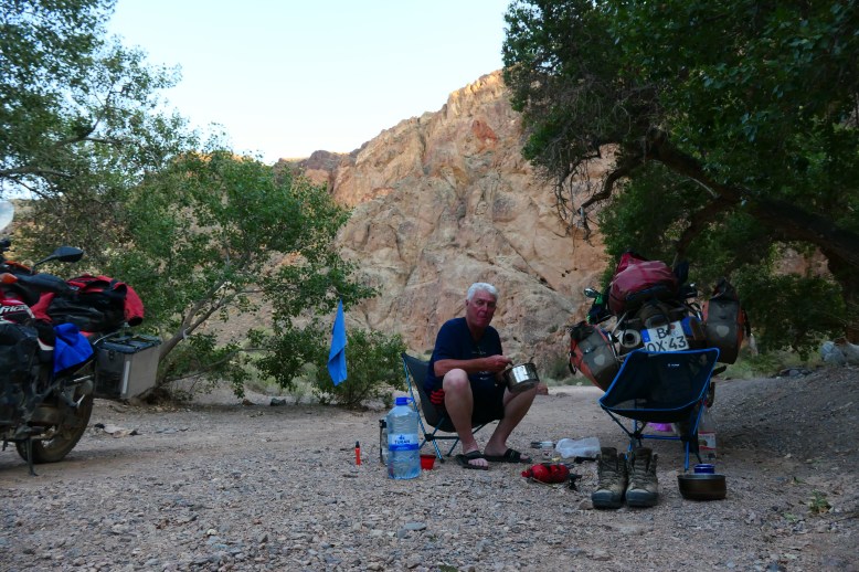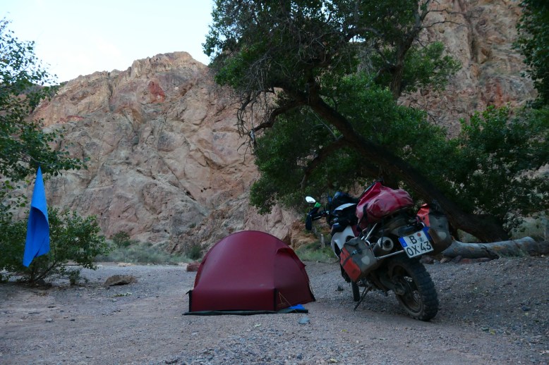 Die letzten 20km führen auf einer zunächst einfach zu befahrenden Piste zum Canyon. Die letzen 3km in den Canyon hinab werden dann aber zu einer heftigen Herausforderung für Steve. Dreimal wirft er die Twin hin, und muss zweimal darunter befreit werden. Schließlich kommt er dennoch unversehrt im Paradies an. Anders kann man den Ort, den wir hier tief im Canyon vorfinden, nicht empfinden. Es ist ein Traum, und der Ort gehört uns! Kaum zu glauben, dass nur ein paar Steinwürfe flussaufwärts ein Touristencamp sein soll. Da der Canyon so schmal und steil ist und zur Gänze vom Sharyn ausgefüllt wird, der voller Macht hindurch rauscht, kann man sich nicht durch den Canyon bewegen, es sei denn man stürzt sich in die Fluten, was sehr gefährlich sein dürfte.