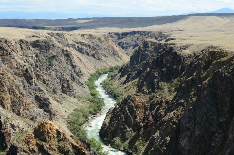 Schon ziemlich nass, ziehen wir – oben angekommen – die Regenklamotten an. Die verbleibenden 17km zur Asphaltstraße, die gestern noch problemlos mit 50km/h zu fahren waren, stellen heute im Regen eine weitere Herausforderung dar. Der Lehmboden ist total aufgeweicht und lässt einen wie auf Schmierseife nur sehr, sehr langsam fahren. Auch hier sucht die Twin noch das eine oder andere Mal Bodenkontakt. Schließlich gelangen wir im Örtchen Aksay zur Hauptstraße und finden dort Unterschlupf in einem Straßencafé, wo wir bei einem leckeren Mittagessen den Regen abwarten. Dann fahren wir nach Saty. Das Wetter ist nicht stabil, doch den größten Teil der Strecke fahren wir im Trockenen. Nach der gestrigen Hitze sind die 15 Grad heute ganz wohltuend. Unterwegs treffen wir nochmal auf den Sharyn, der sich weiterhin tief in die Landschaft gegraben hat.