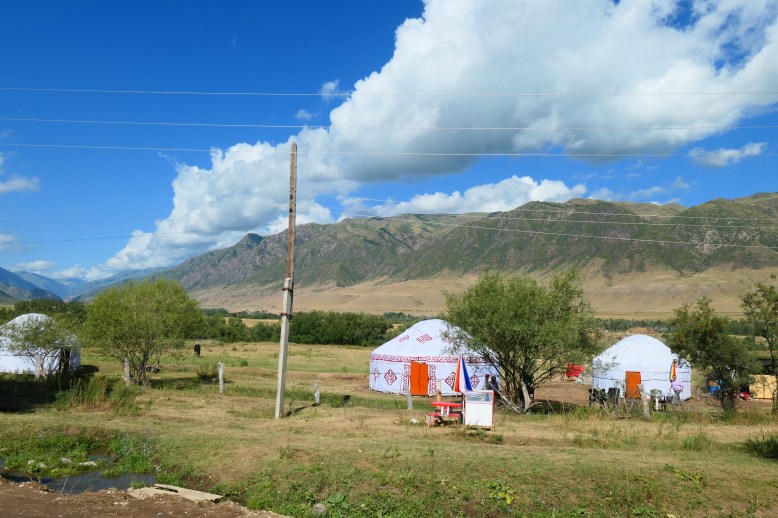 Auf dem Schotterweg dahin sehen wir nach langer Zeit mal wieder Jurten, die sich hier auch so nennen und nicht Gers, wie in der Mongolei.