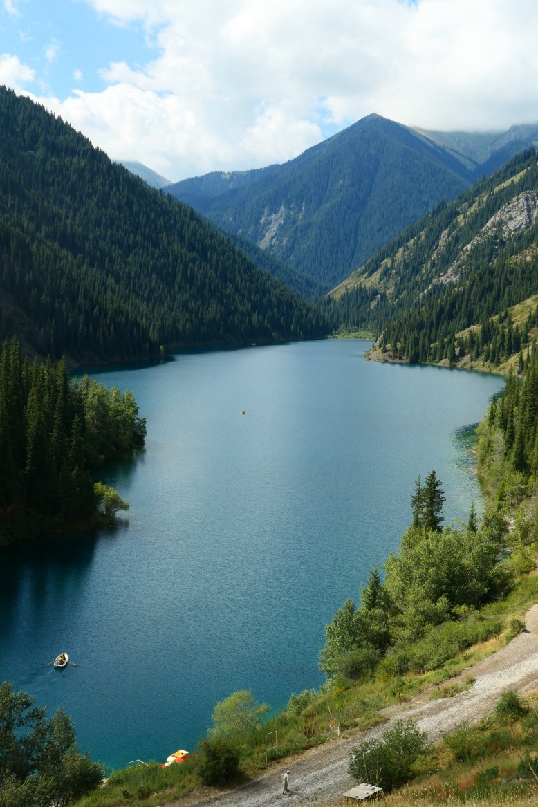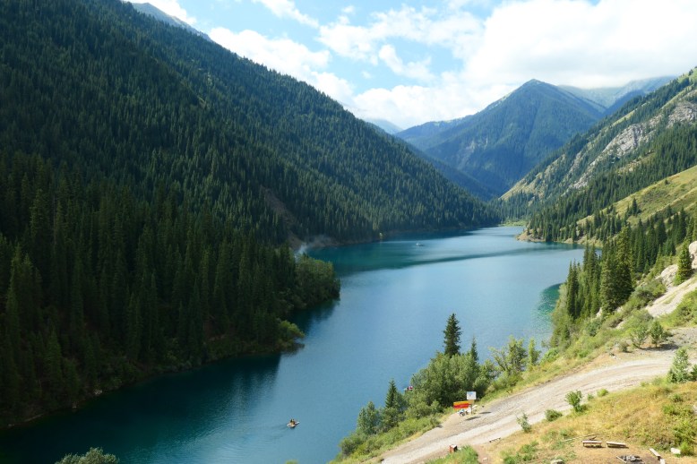 Den Plan, zum Kaindy Lake zu fahren müssen wir leider verwerfen, denn der Regen hat die Piste dorthin total verschlammt. Die GAZ-Geländefahrzeuge haben dann das Übrige dazu getan, dass die Piste für unsere Mopeds unpassierbar ist – Schade eigentlich! Dafür kommen wir auf schöner Bergstraße zum Kolsai Lake, der smaragdgrün im Talkessel liegt.