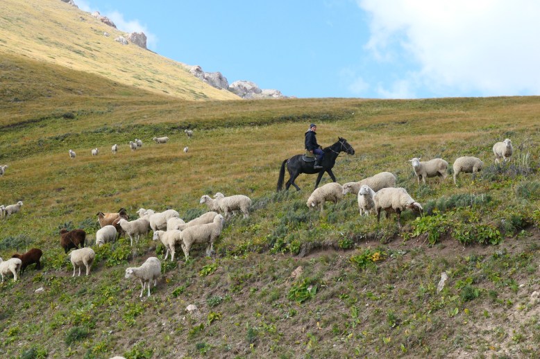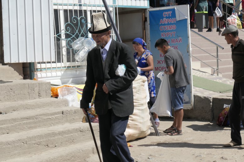 Am Montag machen wir uns dann auf, eines der Highlights Kirgisistans zu erkunden – den Song-Köl, einen rund 100km umfangenden See auf gut 3.000m Höhe. Der Weg dorthin führt durch einsame Berglandschaften und Täler mit reißenden Flüssen, die vereinzelt auch zum Kanufahren und Raften genutzt werden. Immer wieder begegnen uns am Straßenrand alte Männer in traditioneller Kluft mit dem typischen, hohen Filzhut. Man nennt sie einfach Weissbärte.