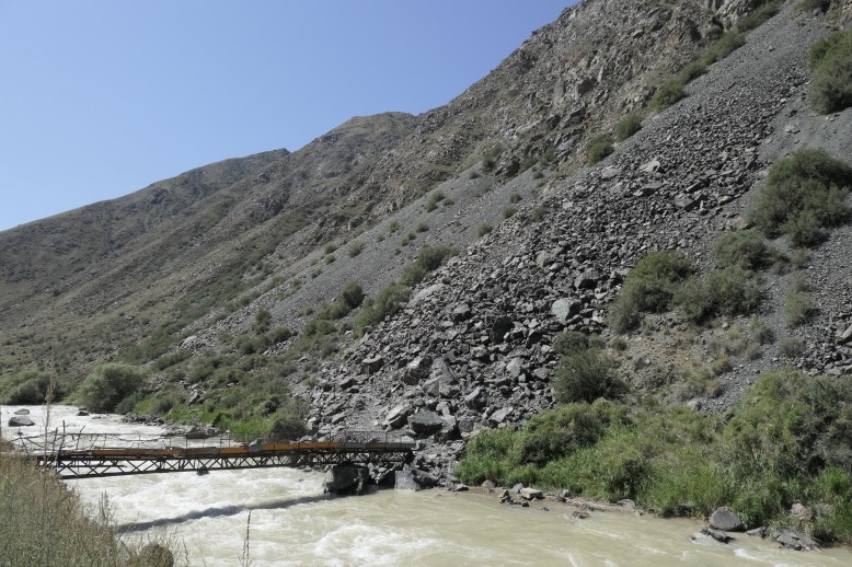 Am Dienstagmorgen setzen wir die Seeumrundung fort. Gleich zu Beginn gilt es einen Flussfurt zu queren, die aber so moddrig aussieht, das wir dankbar der Wegweisung eines Nomaden, der gerade ein Schaf schlachtet, folgen. Dort ist der Fluss ganz schmal, doch dafür tief eingegraben. Ich hopse noch halbwegs elegant dadurch, doch Steve entschärft es, und ein weiteres Mal erweist sich das in Almaty runderneuerte Gepäcksystem als sturzresistent!