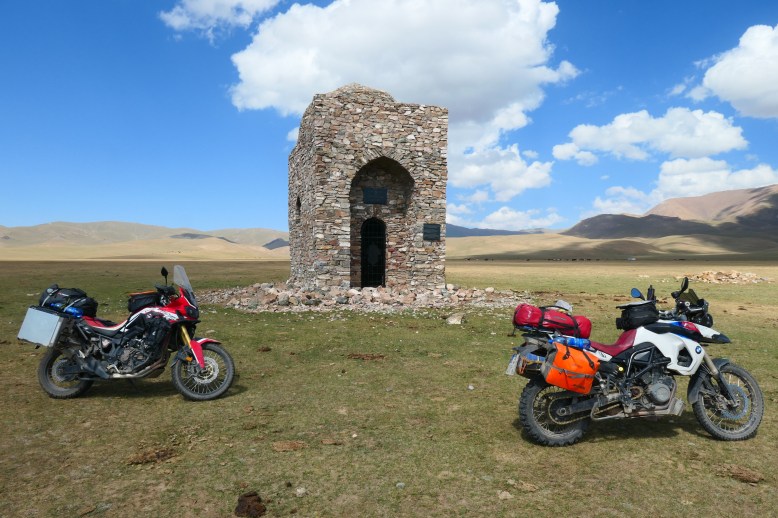 Nur langsam hangeln wir uns dem Nordufer entlang gen Westen, denn die Sinne sind zu sehr betört von den schönen Farben der Kulisse in der späten Nachmittagssonne. Mittendrin im Niergendwo taucht dann das einzige feste Bauwerk am ganzen See auf – ein beeindruckendes Mausoleum für einen Kriegshelden, der Mitte des 19. Jh. tapfer gegen die Kasachen gekämpft hat. Der Hass zwischen Kirgisen und Kasachen wurzelt tief!