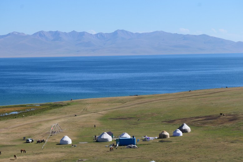 Hinter dem Pass tut sich dann auf einmal das große Tor in eine komplett andere Welt auf! Wie schön ist das denn? Wer hat den Bauplan für diese Kulisse erstellt? Die Augen starren, das Herz hüpft – ich kann gar nicht fassen, was ich hier zu sehen und zu fühlen bekomme! Flach eingebettet in eine riesige, gelb-grün leuchtende Hochebene, und eingerahmt von Bergen der 4.000-5.000m- Klasse, liegt tief blau schimmernd der Song-Köl, der wohl zurecht als schönster Ort Kirgisistans gilt.