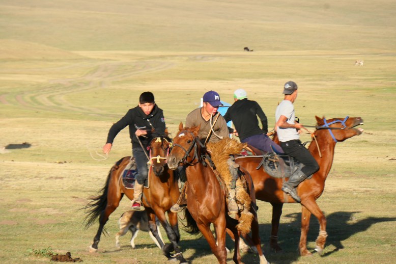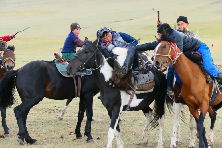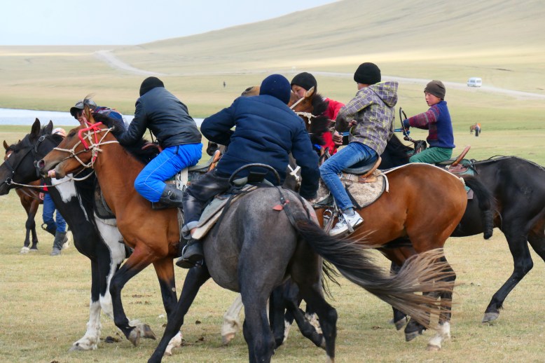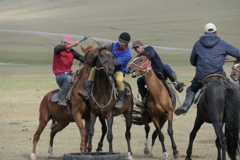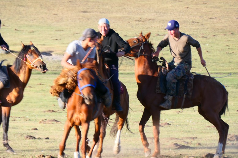 Ich habe wirklich selten einen so spektakulären Sport gesehen. Es ist aberwitzig, mit welcher Akrobatik und Gnadenlosigkeit hier, hoch zu Ross, um das Schaffell gekämpft wird. Das beginnt schon mit dem ersten Aufheben des Fells vom Boden. Sämtliche Spieler halten im Galopp auf das Fell zu und lassen sich kopfüber vom Sattel seitlich auf den Boden hängen, um das Fell als erster aufzulesen. Dann versuchen die anderen ihm das Fell zu entzerren. Dabei sitzt man noch im eigenen Sattel, aber der ganze Oberkörper hängt über dem Pferd eines Mitspielers. Die kleine Peitsche, mit der die Pferde gnadenlos angetrieben werden, wird in diesen Situationen, die beide Hände fordern, lässig im Mund gehalten, oder geht gerne auch mal verloren.