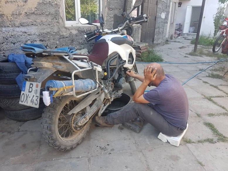 Kaum zwei Stunden später ist die Lichtmaschine mit Vlad’s Hilfe eingebaut, verbunden mit einem Ölwechsel, der eh fällig war. Jetzt wird die Batterie wieder schön geladen! Ich kann kaum in Worte fassen, wie glücklich ich darüber bin, in so kurzer Zeit wieder ein fahrtüchtiges Moped zu haben, denn nun kommt die schönste Etappe der ganzen Reise mit dem Pamir Highway und den alten Städten auf der Seidenstraße. Da wäre es sehr schade gewesen, durchhetzen zu müssen!