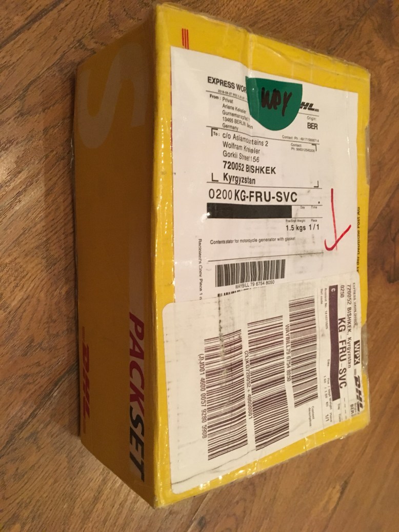 Seit dem habe ich alle paar Stunden den Status der Sendung im Internet verfolgt und war Anfangs vom Fortschritt ganz begeistert. Schnell war das Paket in Leipzig und dann in London. Aber danach tat sich 24 Stunden lang rein gar nichts mehr und ich stellte mich schon darauf ein, dass der vorhergesagte Liefertermin für Dienstag, den 4. September Realität werden könnte – schreckliche Vorstellung! Heute Mittag um 14:30 Uhr schaue ich dann wieder in den Tracker, in der Hoffnung, das Päckchen könne nun in Moskau angekommen sein. Dies soll wohl der normale Versandweg sein, denn Kirgisistan, wie auch Kasachstan haben eine Zollunion mit Russland. Zu meinem größten Erstaunen lese ich dann aber, dass das Paket 31 Minuten zuvor direkt aus London in Bishkek angekommen ist. Eine Minute später wurde es zur Zollfreigabe vorbereitet und weitere zwei Minuten später kam die Zollfreigabemeldung. Dann dauert es nochmal 8 Minuten, bis das Teil im Auslieferfahrzeug landete, und noch während ich das ganze im Tracker lese, klingelt die Réception und bittet mich hinunter, es sei der DHL-Bote da und benötige meine Unterschrift.