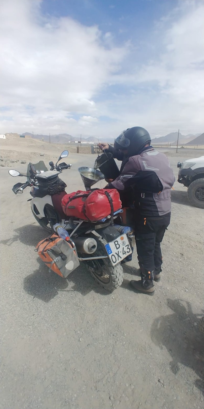 Zum Verweilen lädt dieser Ort allerdings nicht ein, deshalb füllen wir nur noch die Tanks und fahren dann weiter. Das Tanken ist eine Erfahrung für sich. Aus einem großen Fass wird Sprit in einen Eimer gepumpt, der zwar eine 10-Liter-Prägung trägt, dem man aber einen Ausgussschnabel verpasst hat, der ihn vielleicht gerade noch bis 9 Liter füllen lässt. WAS einem da eingefüllt wird (sprich wieviel Oktan) und WIEVIEL, das bleibt am Ende eine Glaubensfrage. Und was da sonst noch alles mit im Tank landet, will ich gar nicht wissen. Ich bezahle am Ende für 9 Liter und der Tankwart zeigt sich mit einem schelmisch-wissenden Lächeln einverstanden.