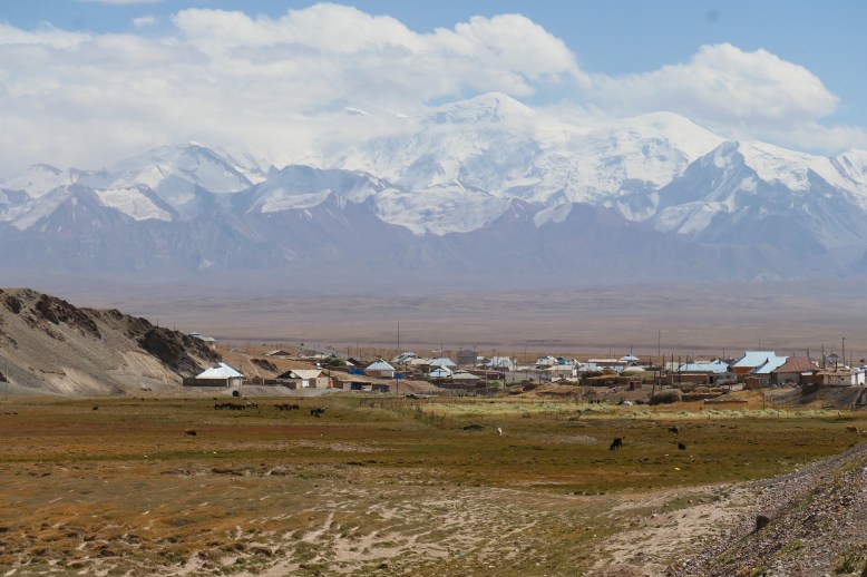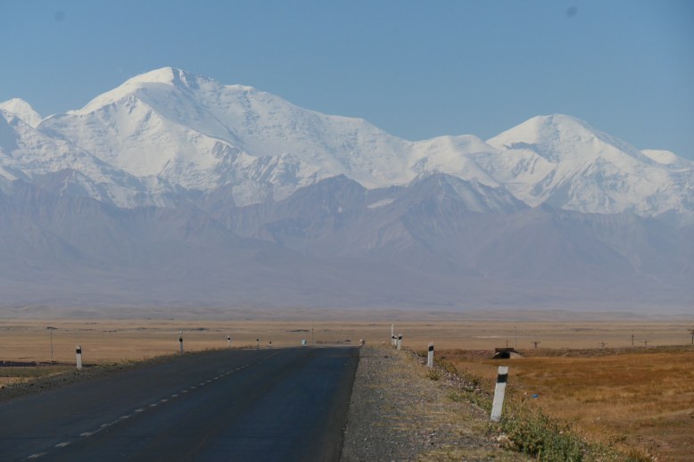 Dann schließt sich das Tal und zwei Pässe um die 3.600m Höhe führen uns in ein riesiges Hochplateau, dessen Südflanke in geschätzten 20km Entfernung von schneebedeckten Bergen der 6.000m-Klasse begrenzt wird. Vom letzten Pass halten wir genau auf diese Begkette zu, die in der Spätnachmittagssonne hinter einem Dunstschleier rot glühen – was für ein Anblick! Und gleich am Anfang des Plateaus endet der Pass im Örtchen Sary-Tash, dass im wesentlichen aus einer Tankstelle, zwei Lädchen und einigen Dutzend Häusern – darunter ein paar Homestays – besteht.