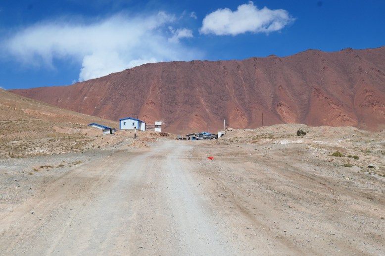 Es herrscht gerade Mittagspause als wir dort ankommen. Man bedeutet uns, die Schuhe auszuziehen und hereinzukommen, um auch in die Schüssel mit Reis und Schafsfleisch zu greifen. Die Höflichkeit gebietet zwei, drei winzige Griffe, mehr will ich meinem Magen nicht zumuten! Dann erbarmt sich ein Zöllner, uns abzufertigen. Er verlangt 500 Som nachträglich für die Einfuhr der Mopeds nach Kirgisistan, was mir unrechtmäßig erscheint. Auch will er die Zolldeklaration haben, die wir am Russischen Zoll bei der Ausreise aus der Mongolei ausgefüllt haben. Zum Glück haben Steve und ich diese beide noch nicht weggeworfen. Da Kasachstan und Kirgisistan eine Zollunion mit Russland haben, muss diese Deklaration bis zum Verlassen dieser Union aufbewahrt und dort abgegeben werden, nur dass einem dies niemand zuvor gesagt hat! Ohne dieses Papier hätte es keine Ausreise nach Tadjikistan gegeben – Puh, Glück gehabt! Anschließend werden noch die Pässe gestempelt und dann werden wir ins Niemandsland entlassen. Auf 20km führt uns eine Piste, für deren Unterhalt offensichtlich niemand zuständig ist, zum Grenzpass auf 4.290m Höhe. Die Auffahrt hat keinerlei Serpentinen und verläuft dementsprechend steil. Kurz hinter dem Pass liegt der tadjikische Grenzposten. Dieser ist ungleich spartanischer eingerichtet als der kirgisische. Einfache Container dienen hier zugleich als Amtsstuben und als Wohnstätten. Daher ist vor Betreten stets Schuheausziehen angesagt!