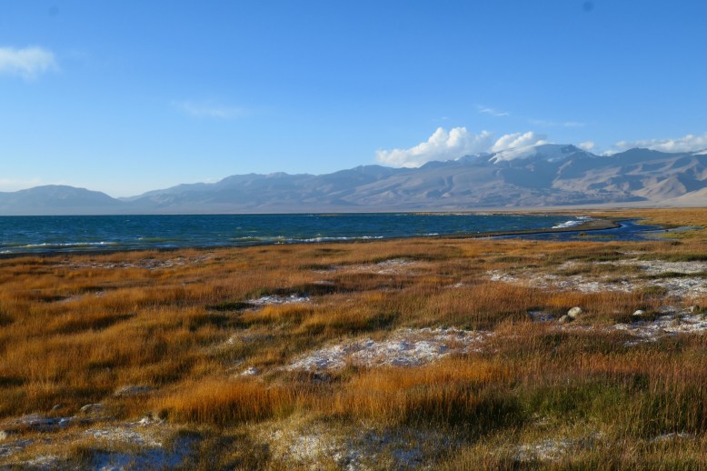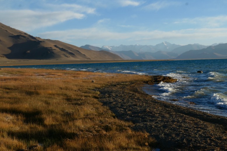 Nach einer knappen Stunde taucht zur Rechten der Karakulsee auf. Blau und glatt liegt er mit 230 qkm Größe mitten im Hochplateau, gesäumt von schneebedeckten Bergen. Außer dem kleinen Dorf Karakul gibt es absolut nichts an diesem riesigen See. Die Farben der Ufersteppe kontrastieren so schön mit dem Blau des Wassers, dass es fast kitschig ist.