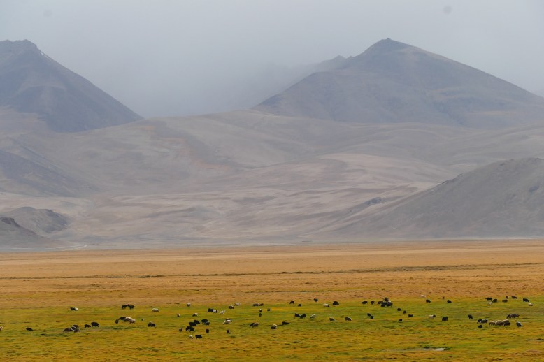 Nach einer langen Passabfahrt unter wolkenverhangenem Himmel taucht in der Ferne Murgab auf – eine seltsame Siedlung entlang der Pamir-Piste mit einem bedeutenden Bazar. Dort finden wir eine Bank, die uns Dollar in Somoni tauscht und auf dem Bazar einen Megafon-Shop, der uns lokale SIM-Karten verkauft.