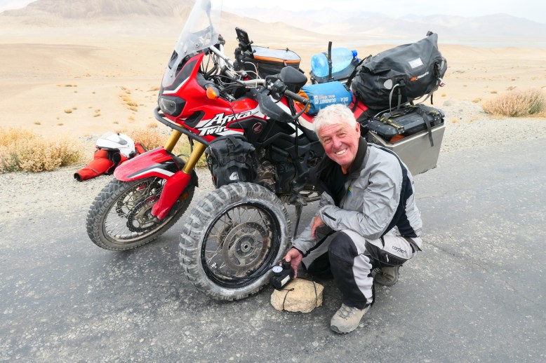 Was für ein Glück , dass das noch gerade vor der Trennung passiert. So habe ich noch den Seitenständer von Steve’s Africa Twin, ohne dessen Hilfe ich den Reifen nicht aus dem Felgenbett bekommen hätte. Auch seine zusätzlichen Reifen-Montierhebel und sein Kompressor sind willkommene Hilfen, die mir die Arbeit erheblich erleichtern, und so ist das Moped nach etwas mehr als einer Stunde wieder fahrbereit.