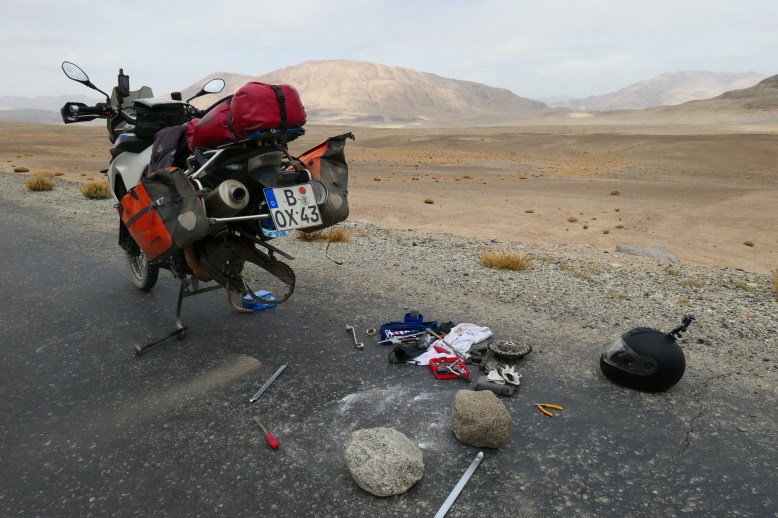 Es ist Donnerstag, als wir am Morgen ohne Frühstück Rachima und ihr Shukrona Homestay verlassen. Bis wir uns für die nächsten drei Tage trennen fahren Steve und ich ab Alichur noch 25km gemeinsam auf dem Pamir-Highway bis zur Abzweigung zum Wakhantal. Der Highway war hier zwar zu Sowjetzeiten mal asphaltiert, doch viel ist davon nicht übrig geblieben. Deswegen bin ich mir zunächst auch nicht sicher, ob es am schlechten Untergrund liegt, dass mein Moped so unruhig fährt, oder ob ich mit einem platten Reifen fahre. Ich halte an und muss leider feststellen, dass letzteres der Fall ist. Und dann natürlich wieder der hintere Reifen! Ein kleiner Nagel hat sich eingedrückt.