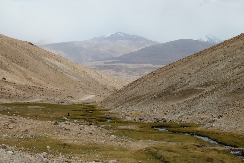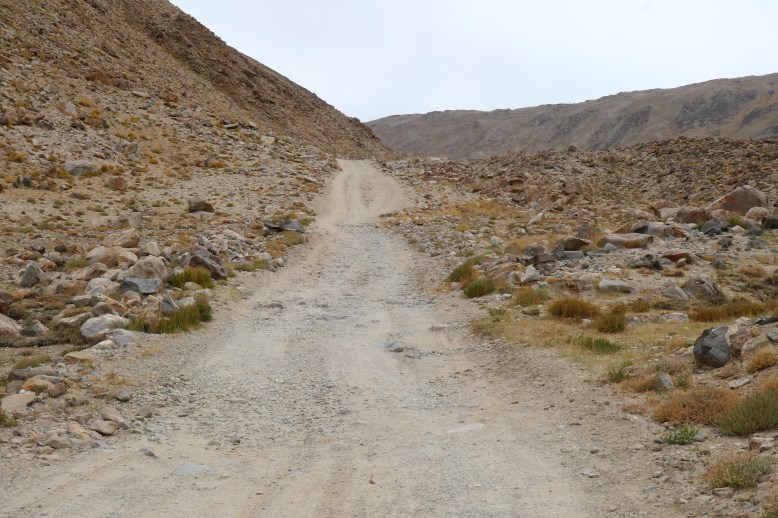 Die Piste zum Wakhan-Korridor ist von Anfang an spannend. Auf zum Teil sandigem und dann wieder felsigem Gund geht es nach ein paar Kilometern steil zum Khargush-Pass hinauf. Der Himmel ist verhangen, die Farben bleiben im Ungefähren und ich fühle mich allein auf der Welt.