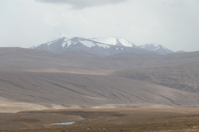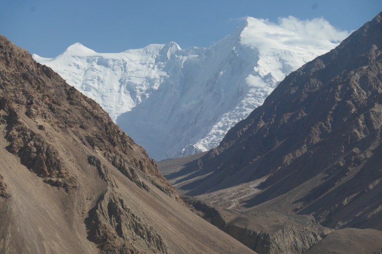 Dieser Eindruck ändert sich dann aber schnell bei der Abfahrt vom Pass in das Flusstal des Pamirs. Schon von der Passhöhe sticht der 6.320m hohe Koh-i Pamir ins Auge, der in zweiter Reihe mit seiner Schneemütze sämtliche Berge überragt.