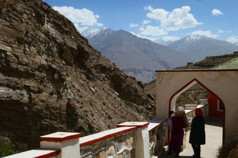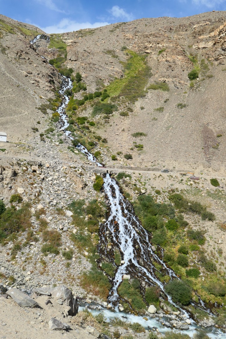 Die Anlage der Quelle ist – wie sie da hoch über dem Tal in die Felsen gebaut wurde – auch schon ein Erlebnis für sich. Von dort bietet sich ein Super-Ausblick auf einen Gletscher in der zweiten Reihe des Hindukusch. Auf der Abfahrt zurück ins Tal treffe ich den ersten Mopedfahrer seit drei Tagen, und dann auch noch jemanden, den ich schon aus dem Tes-Guesthouse in Osh kenne. Jürgen aus Wien fährt gerade zur Quelle herauf. Wir bleiben auf einen Plausch stehen und verabreden uns für den Abend im Hostel in Ishkashim, wo wir gemeinsam bleiben wollen.
