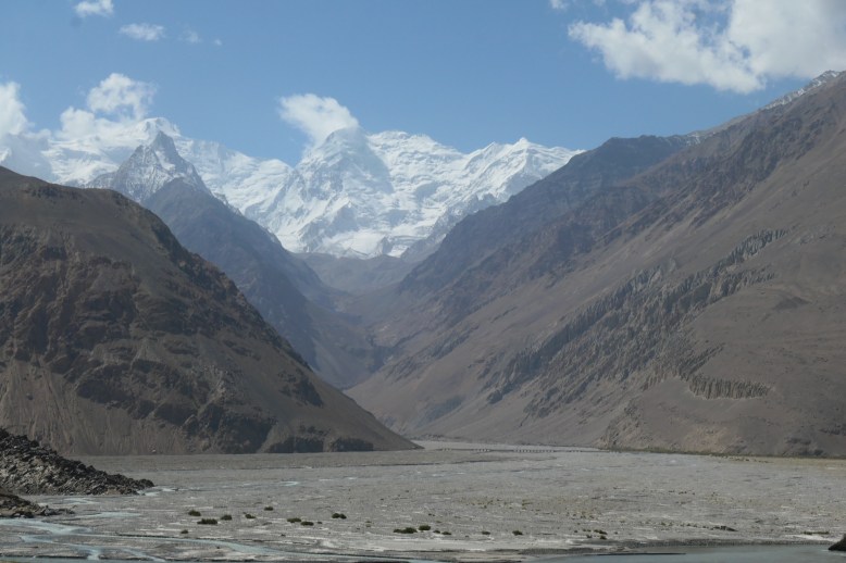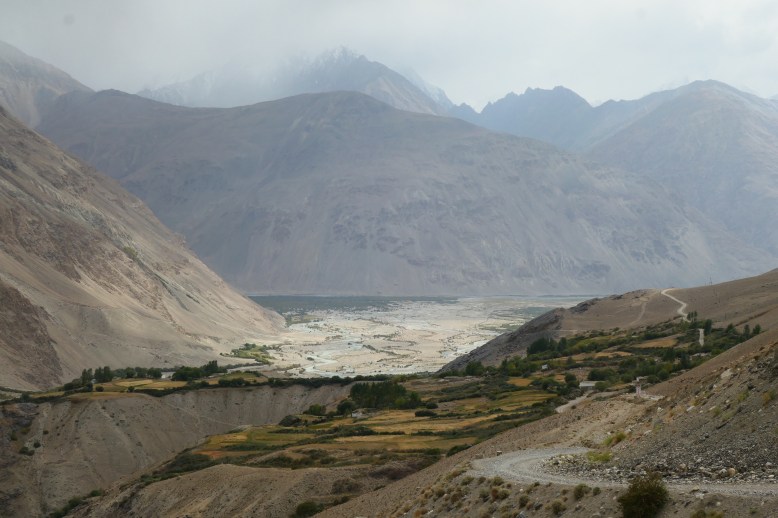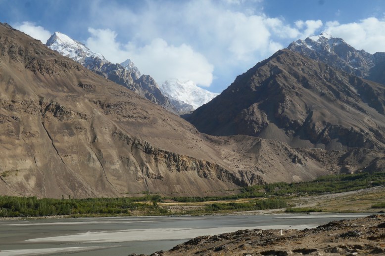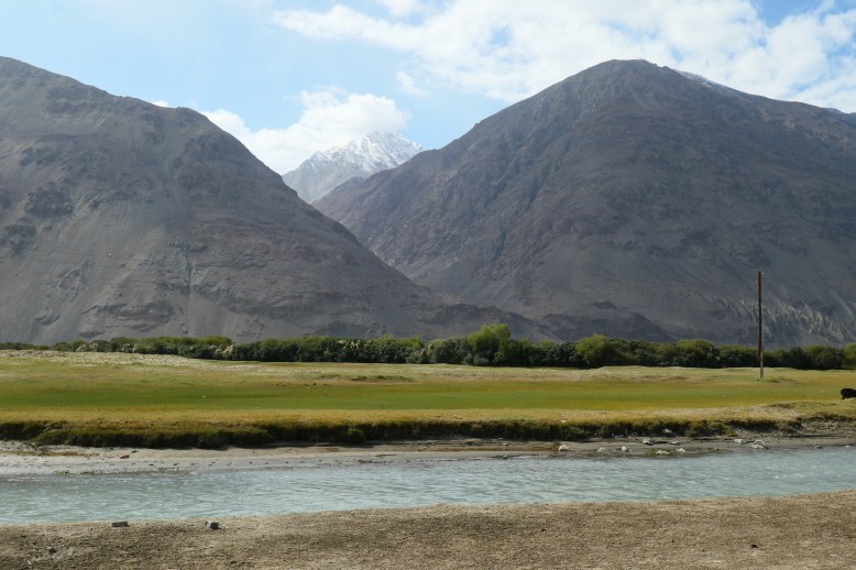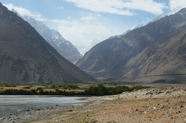 Das ist übrigens kennzeichnend für den Hindukusch entlang des Grenzflusses: Die hohen, schneebedeckten Berge liegen alle in der zweiten Reihe und sind nur ab und zu durch Taleinschnitte der ersten Reihe zu sehen. Das bietet oftmals grandiose Perspektiven!