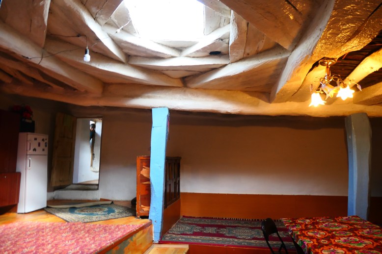 In Langar quartiere ich mich in ein nettes Homestay ein, in dem es ein klassisches Pamir-House gibt. Das besondere daran ist die spezielle Dachform mit einer Art verschachteltem Oberlicht und die Abstützung der Dachkonstruktion mit fünf Säulen, was der Tatsache Rechnung trägt, dass wir hier in einer Erdbenbenregion sind.