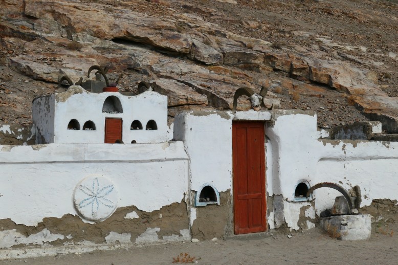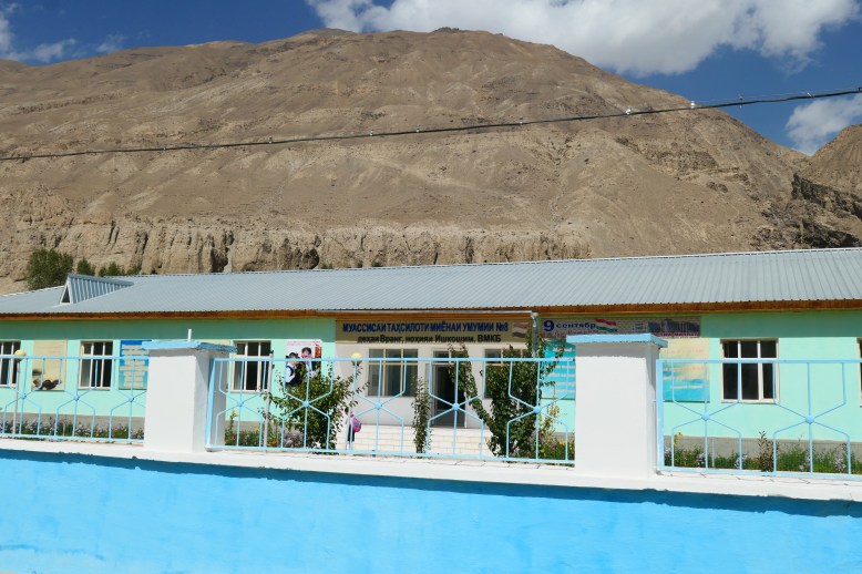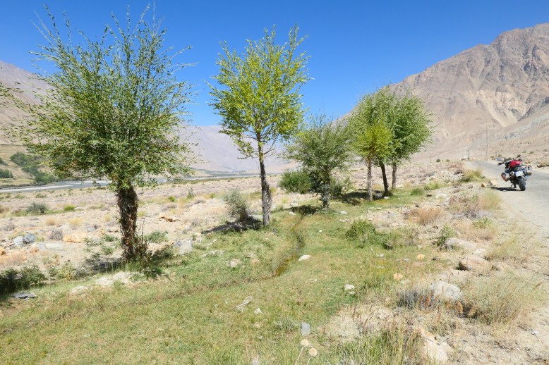 Ab Langar fühlt sich die Fahrt zwischen den beiden Gebirgen ganz anders an. Die afghanische Seite bleibt weiterhin wild und unbesiedelt, doch die Trampelpfade sind nun zu einer richtigen Piste ausgewachsen, die zum Teil mit erheblichem Aufwand in die Felsen gehauen wurde. Man fragt sich nur: Für WEN? Auf tadjikischer Seite hingegen beginnt ab Langar das Leben. Etwa alle 10-15km tauchen kleine Siedlungen auf, die überraschend freundlich gestaltet sind. Meistens ist die Piste im Ortsbereich von schattenspendenden Pappeln gesäumt. Die Häuser sind solide Steinbauten, schön weiß gestrichen und umgeben von adrett angelegten Gärten.