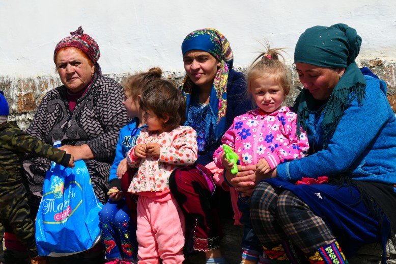 Am späteren Vormittag komme ich zu den heißen Quellen von Shihrin. Diese wurden im Reiseführer so angepriesen. Ich erkenne nur an den Mineralablagerungen, die am Wegesrand in bunten Farben auffallen, dass ich wohl schon da sein muss. Dann treffe ich auf eine Gruppe Frauen mit kleinen Kindern, die rechts am Pistentand vor einem Gebäude sitzen und offensichtlich auf eine Mitfahrgelegenheit warten. Sofort kommt ein kleines, stämmiges Mütterchen auf mich zu und reißt mir erstmal – beherzt schmatzend – ein riesiges Stück aus ihrem Fladenbrot heraus und fordert mich zum Essen auf. Ich hätte nicht auf ihre Hände schauen sollen, dann wäre das ein vorbehaltloser Genuss werden können. Aber es schmeckt auch aus dreckiger Hand sehr gut!