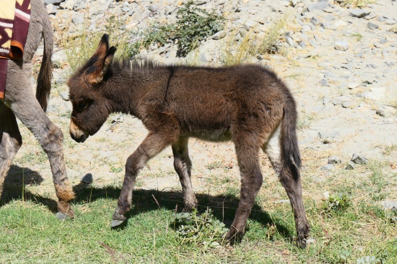 Nach angeregter Unterhaltung und der Erlaubnis für ein Photo, verabschiede ich mich vom Damenensemble und finde mich bald darauf in Vrang, einem weiteren hübschen Dorf mit großer Schule und Pappelallee. Dort treibt gerade Miraz seine bunte Herde durchs Dorf, die so ziemlich alle vierbeinigen Herdentiere enthält, die es in Tadjikistan gibt – fehlen nur noch Kamele. Besonders angetan hat es mir ein Eselfohlen, das nur wenige Wochen alt sein dürfte.