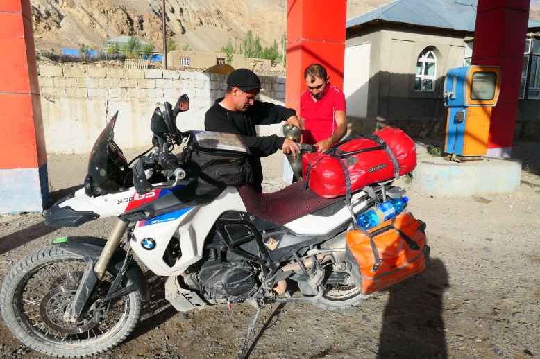 Dort trifft Jürgen nur kurz nach mir ein, nachdem ich zuvor nochmal das unorthodoxe Tankprozedere der Pamiri ausprobiert habe. Ich brauche nämlich noch ein paar Liter, um morgen sicher nach Khorog zu kommen, wo es wieder Tankstellen mit ordentlichen Zapfsäulen geben soll.