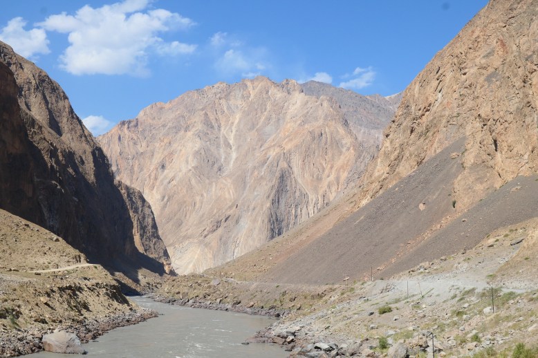 Vor Kalaikum gräbt sich der Panj tief in einen Canyon ein. Die Berghänge ragen bestimmt 2.000 oder mehr Meter direkt aus dem Fluss auf, und die Piste ist über dem Ufer in den Fels gehauen – ein spektakulärer Streckenverlauf. Dazu kommt ein starker Wind auf, der uns entgegen bläst. Zuweilen wirbelt er dichte Staubwolken auf, die uns vollständig die Sicht nehmen. Wie gut, dass es keinen Gegenverkehr gibt!