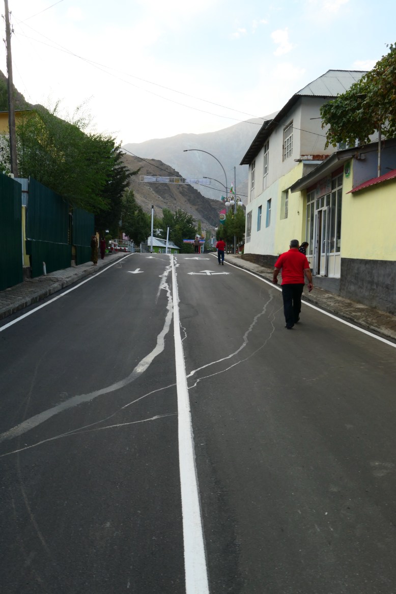 Erst kurz vor Sonnenuntergang erreichen wir ziemlich abgekämpft Kalaikum – ein nettes kleines Städtchen, das sich in heller Aufruhr vor dem morgigen Präsidentenbesuch befindet. Da wurde schnell mal die Hauptstraße neu asphaltiert und wird gerade noch mit frischen weißen Linien versehen.