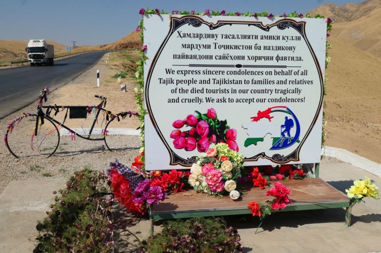 Auf dem Weg dahin passieren wir die Stelle, an der am 28. Juli sieben Fahrradtouristen aus Frankreich, den Niederlanden und der USA Opfer eines islamistischen Attentat wurden. Vier wurden dabei gerötet und drei schwer verletzt. Tadjikistan hat dort in kurzer Zeit ein Denkmal errichtet, das mich schwer berührt.