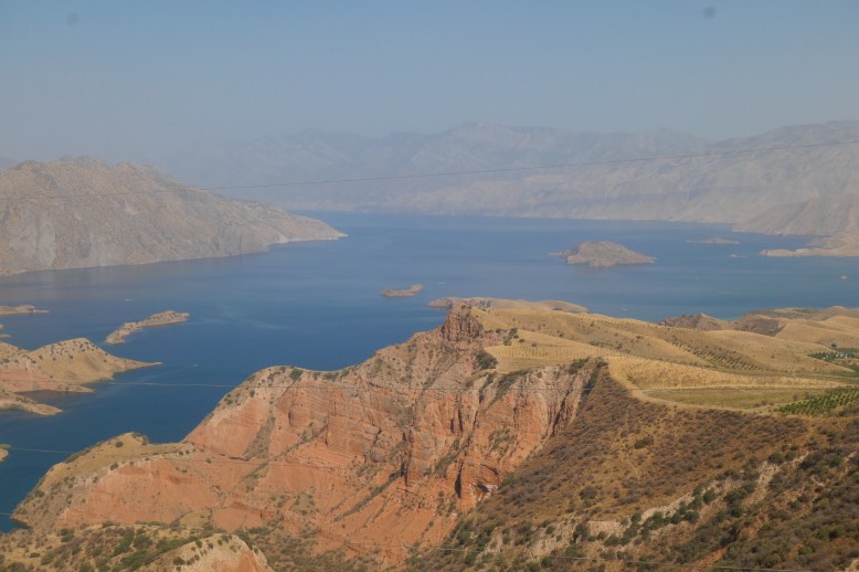 Gegen Mittag wendet sich die Straße vom Panj in nordwestliche Richtung ab. Hier endet nach fast 700 Kilometern und 5 Tagen die so vertraute Kulisse entlang der afghanischen Grenze – schade eigentlich. Es war mir eine sehr angenehme und irgendwie lieb gewordene Szenerie! Fahrerisch wird die nun folgende Strecke sehr interessant. Enge Kurven durch rotgefärbte Berge führen zunächst nach Kuyarb und dann weiter zum Blauen See – ein Stausee, der sehr malerisch in den Ausläufern des Pamirgebirges liegt.