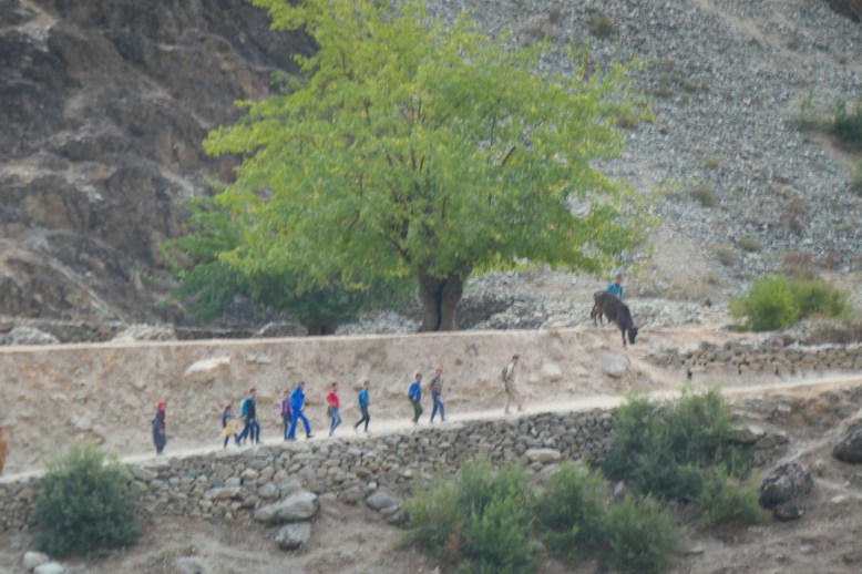Er heißt zwar „Highway“, doch der Abschnitt von Khorog nach Kalaikum ist fast noch schlechter zu fahren als das Wakhan-Valley. Neun Stunden reine Fahrtzeit für 230km Strecke geben eine ungefähre Vorstellung davon, wie schlecht die Straße ist. Wir folgen weiterhin dem Grenzfluss Panj, der – in Bereichen ohne Stromschnellen – mühelos zum afghanischen Ufer zu durchschwimmen wäre. Dieses wird, je mehr wir in den Westen kommen, immer belebter. Es tauchen nunmehr richtige Häuser anstelle der Hütten zuvor auf. Doch nach wie vor keine Spur von Elektrizität!