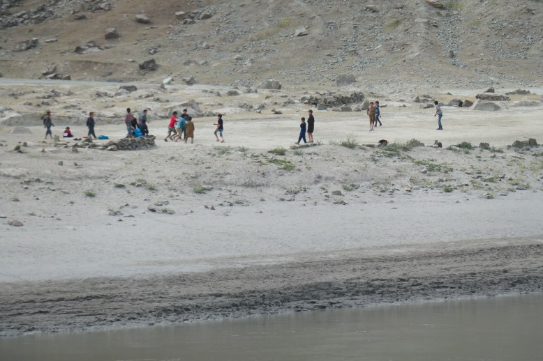 Irgendwann erblicke ich am afghanischen Ufer eine wahre Völkerwanderung. Die Leute winken und rufen, als sie mich beim Photografieren entdecken. Der Menschenstrom endet an einer kleinen Siedlung, wo gerade ein sehr staubiges Fußballspiel ausgetragen wird.