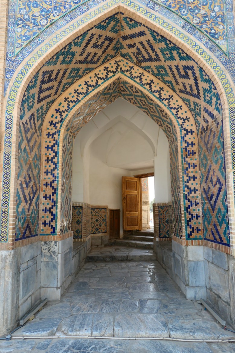 So ist es hier am Registon der Fall. Eine Medrese ist ein gigantisches Bauwerk mit hoher Portalfront, das zugleich Moschee und Lehranstalt war. Es ist quasi ein komplett umbauter Campus, der um die 100 Studenten untergebracht und in den verschiedensten Disziplinen ausgebildet hat. Die Disziplinen zeigen sich jeweils in den Verzierungen an den Fassaden, wo mal religiöse, mal astronomische und mal mathematische oder medizinische Motive zu entdecken sind. Man kann sich angesichts dieser Aufwände gut vorstellen, was für eine wissenschaftliche Hochkultur hier im Mittelalter geherrscht haben muss!