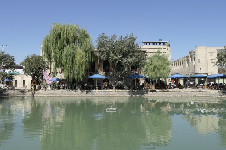 Zum Luxuszimmer gibt es am Montagmorgen auch ein Luxusfrühstück mit frischem Obst, Spiegelei, Pfannkuchen, etc. Danach geht’s auf Sightseeingtour. Die Medresen mögen hier kleiner sein als in Samarqand, doch das ganze Stadtgefüge von Bukhara ist zusammenhängender. Alle Gebäude fügen sich harmonisch in die Fluchten der Gassen ein, die jeweils zum nächsten Bauwerk führen.