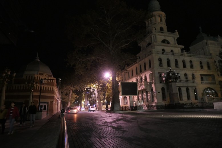 Danach bekomme ich seit dem Pamir-Highway zum ersten Mal wieder Schotter unter die Räder. Über 50 Kilometer ist die alte Sowjetstraße derart zerstört, dass vom Asphalt nichts mehr übrig geblieben ist. Kurz vor der Dämmerung erreiche ich Gänçä, eine schöne, alte Stadt, die vor langer Zeit schon mal Hauptstadt von Aserbaidschan war. Dort finde ich ein simples Hostel mitten in der Altstadt und kann mir diese bei nächtlicher Beleuchtung anschauen.