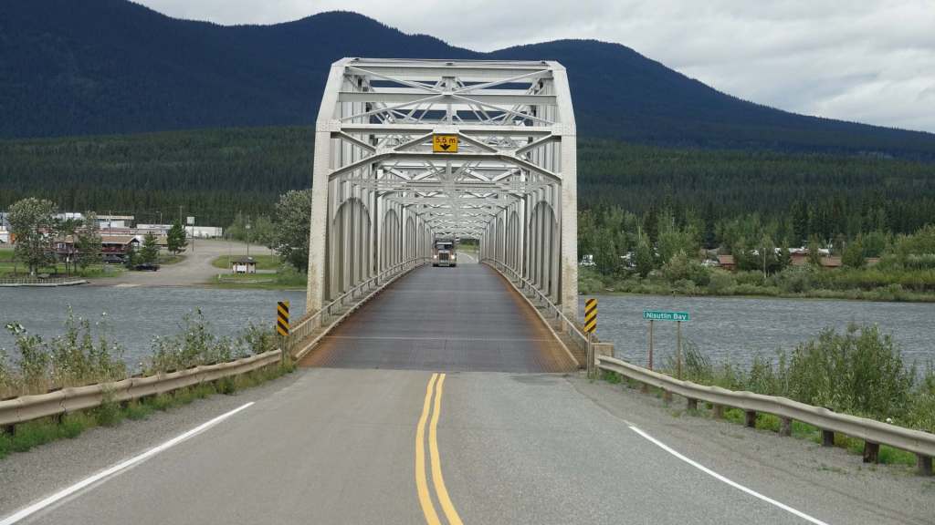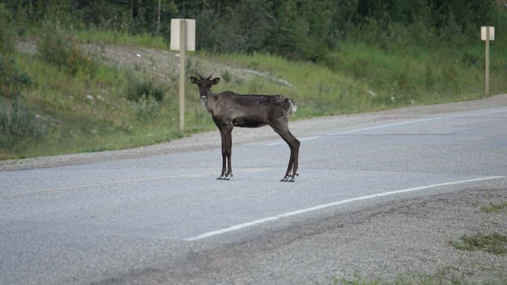 Von Fort Nelson fahre ich nach ausgiebiger Mittagspause weiter auf dem Alaska Highway ins Bergland hinein. Mittlerweile zählt der Highway schon Kilometer 500 und hat hier nicht mehr viel mit einem Highway zu tun. Die Straße windet sich durch die Berge, überwindet dabei zahlreiche Flüsse mittels Stahlbrücken, deren Fahrbahn aus einem Gitterrost besteht, das mit dem Motorrad unschön zu befahren ist. Dazu sind weite Strecken des Highways hier geschottert, was schön ist, solange keine anderen Fahrzeuge, insbesondere keine Trucks, unterwegs sind. Denn dann heißt es „Staub schlucken“ und das nicht zu knapp! Auf der Suche nach einem Schlafplatz bricht die Dämmerung ein, als ich mich zum Summit-Pass hinaufwinde. Als ich ein junges Elch-Kitz am Straßenrand entdecke, wird mir klar, dass ich um diese Zeit besser nicht mehr auf der Straße sein sollte.